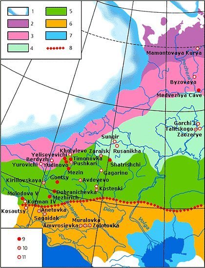 En rysk karta över de arkeologiska fyndplatserna från före det maximala skedet och under det. Siffrornas uttydning: 1. Inlandsisen gränser. 2. Subarktiska ängar. 3. Tundra med inslag av stäpp. 4. Stepp med inslag av tundra. 5. Stepp med permafrost. 6. Stepp med snötäckta vintrar. 7. Översvämningszon. 8. Gräns för permafrostzonen. 9. Fyndplatser från före senaste istida maximum. 10. Fyndplatser från det istida maximumet. 11. Fyndplatser från tiden omedelbart efter maximumet. Den som orkar ta sig igenom den ganska komplicerade kartan kan notera en förskjutning österut av bosättningarna. Klimatet närmare Uralbergen var aningen bättre än närmare den västra delen av en euroasiatiska isskölden.