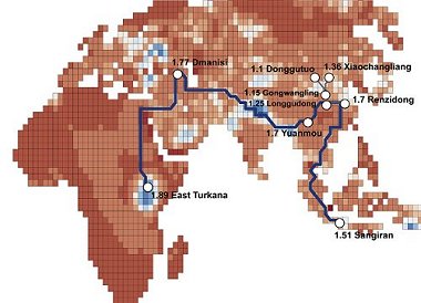 Datorsimulerat förslag till karta över Homo erectus utvandring från Afrika och spridning över Asien med början för omkring 1,9 miljoner år sedan. Karta enligt Carotenuto et al 2016.